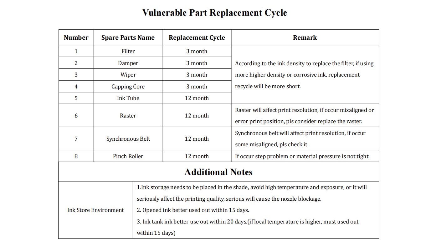 For efficient print room management and consistent results, please refer to the scheduled replacement cycles for essential sublimation printer parts below. This schedule serves as a general guideline; actual intervals may be influenced by usage intensity and the specific inks and substrates used.